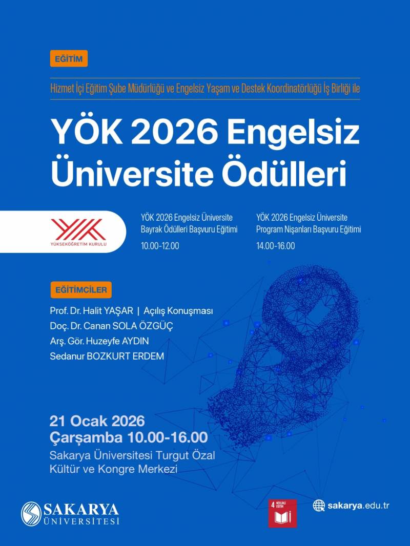 Sakarya Üniversitesi Personel Dairesi Başkanlığı Hizmet İçi Eğitim Şube Müdürlüğü ve Engelsiz Yaşam Koordinatörlüğü iş birliğinde düzenlenen etkinlikte, üniversitelerde engelsiz eğitim anlayışının geliştirilmesine yönelik güncel uygulamalar ve başvuru süreçleri ele alındı. Eğitimde Sakarya Üniversitesi Rektör Yardımcısı Prof. Dr. Halit Yaşar, Engelsiz Yaşam Koordinatörlüğünden Doç. Dr. Canan Sola Özgüç, Arş. Gör. Huzeyfe Aydın ve Sedanur Bozkurt Erdem konuşmacı olarak yer aldı. Haberin devamı için...